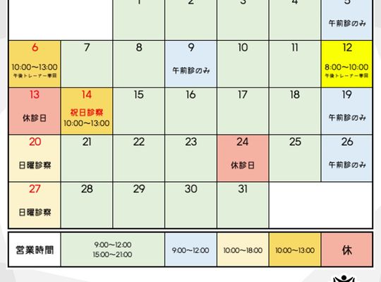 10月の診療カレンダー|肩こり・腰痛・交通事...