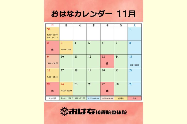 遅くなりましたが、11月の診察日程をお知らせいたします。